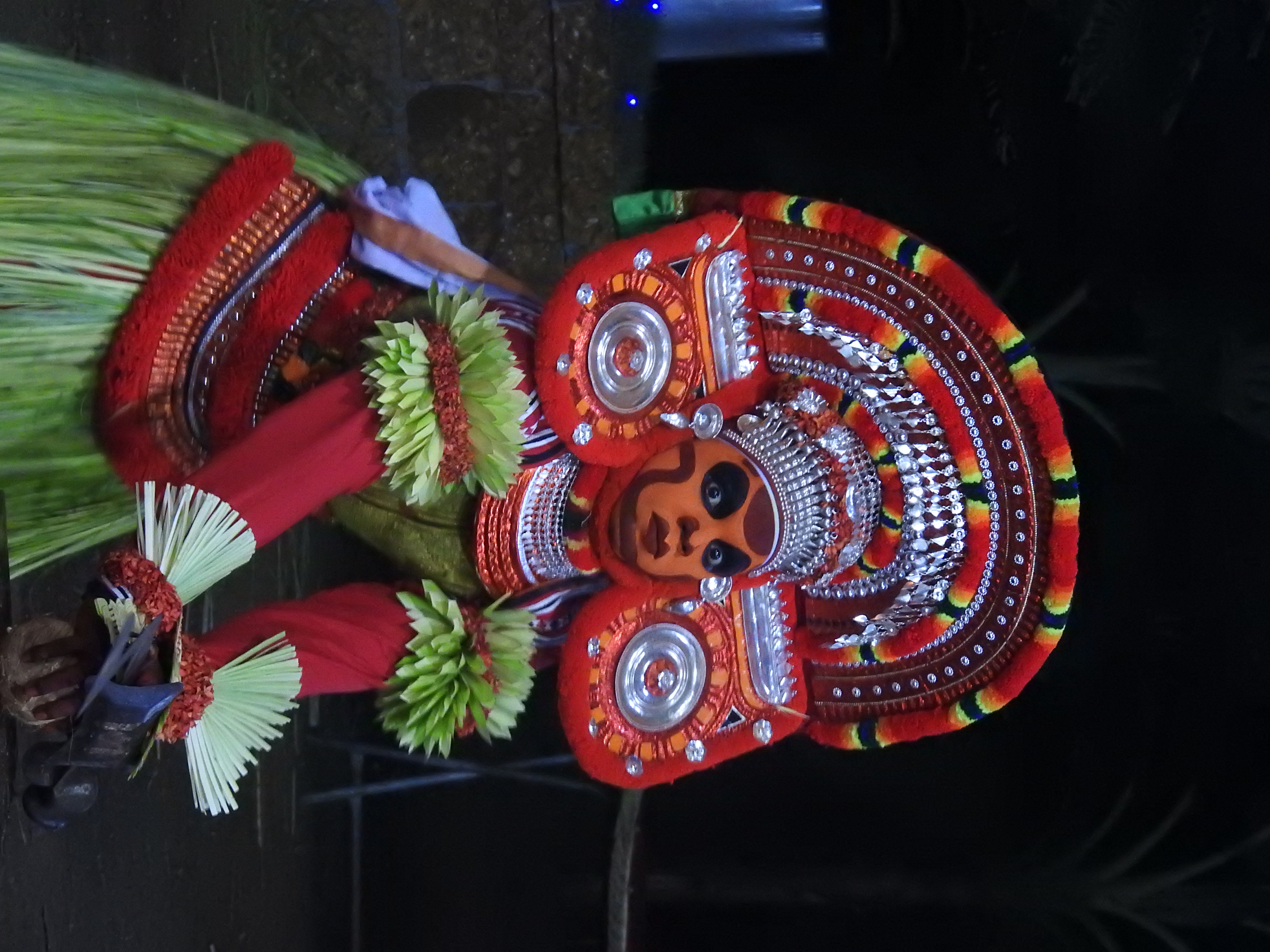 A Theyyam performer in full ceremonial regalia during a night ritual